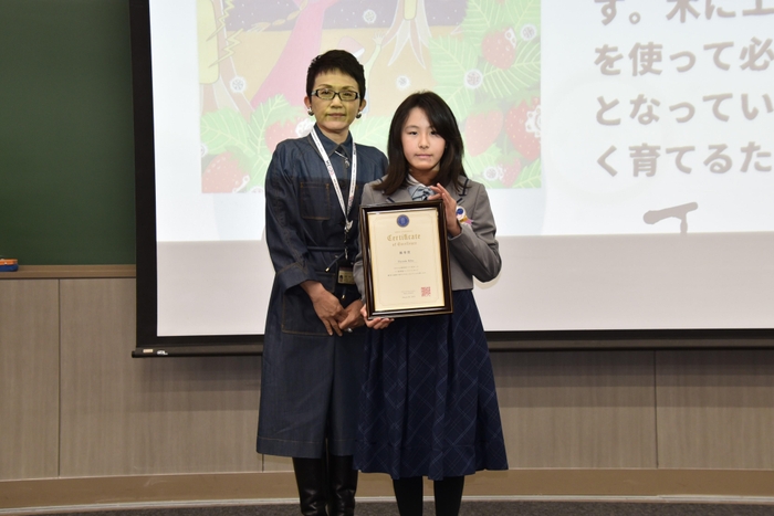 表彰式では、初めに小原学長があいさつし「絵の技術だけでなく、作品に描いた夢のコンセプトも含めて皆さんの作品に感心しました。夢を考えることは楽しいですが、これからはその夢を実現するにはどうすればいいかも考えてください」と呼び掛けました。吉野終身教授、小原学長、上山教授、立花理事長、伊深智美渉外部事務部長が受賞者1人1人に表彰状を手渡しました。