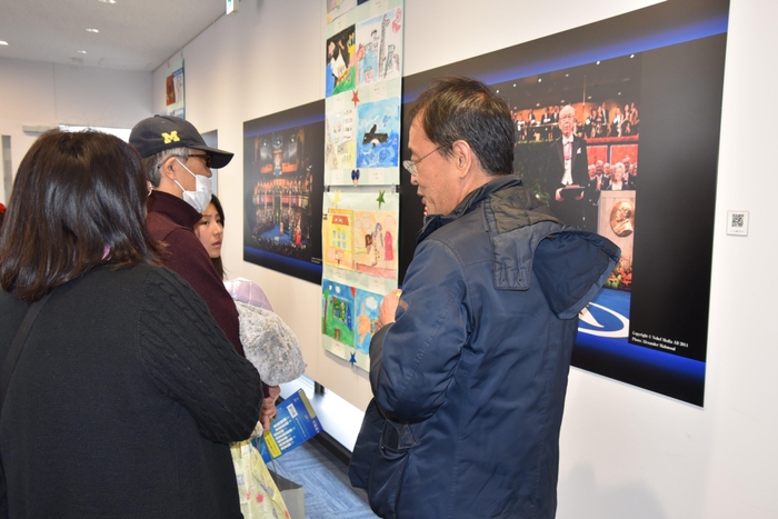 式後には、受賞者とその家族は応募作品を展示している天白キャンパス内の校友会館4階の「赤﨑・天野・吉野ノーベル賞記念展示室」を見学。吉野終身教授が自らリチウムイオン電池の開発の経緯や特徴などを説明し、「サスティナブル社会が実現した2050年はどんな世界になっているか考えてください」と「宿題」を出したり、受賞者とともにノーベル賞のメダルのレプリカの前で記念撮影に臨んだりしました。
