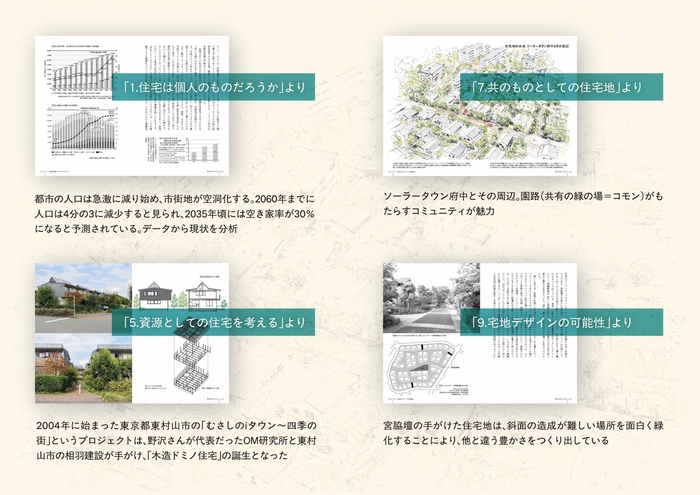 人口の減少期にあって、有り余る空き家はいかに活用されようか。いまある住宅地は再編可能か、より良い居住のかたちはどこにあるのか。求められる持続可能社会の住宅、住宅地、特に郊外住宅地はどのような形で生き残るのか。郊外の住宅地を考え、その対応策を模索し、提示する。