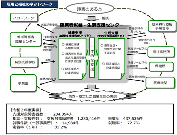 障害者の身近な地域において就業面と生活面の一体的な相談・支援を行う 「障害者就業・生活支援センター」を設置(令和3年4月現在 336センター)