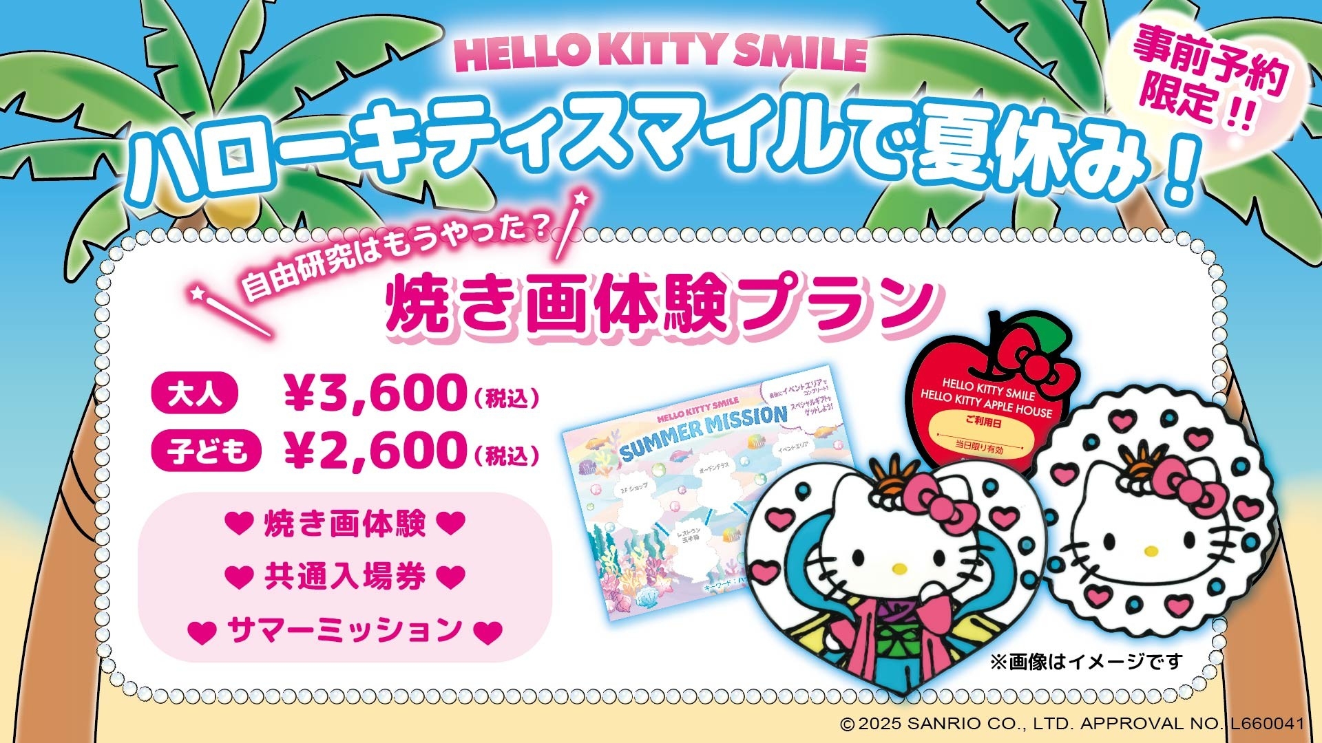 内容:メディアアート&レストラン「HELLO KITTY SMILE」の入場券に加え、当施設の1階イベントエリアで大人気の焼き画体験、ハローキティのりんごのおうち「HELLO KITTY APPLE HOUSE」入場券、さらに夏季限定イベントのサマーミッションカードがセットになった限定プラン
