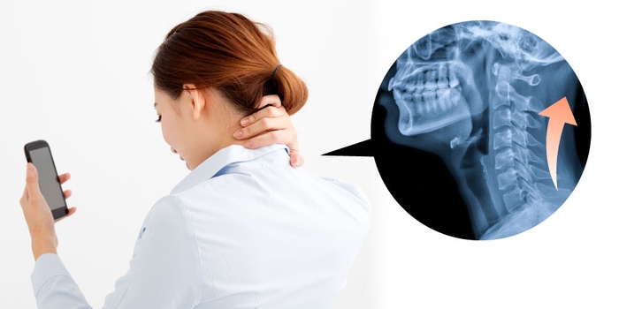 スマホを見る時のような姿勢、首を前に出した状態を続けることが原因のひとつと言われています。
