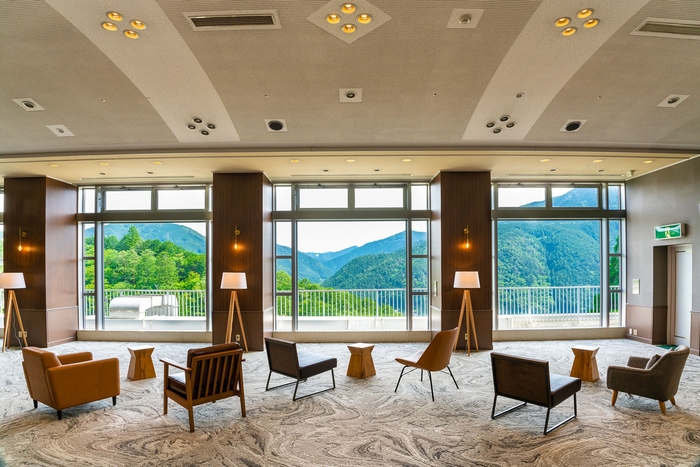 南飛騨の山河を望む開放的なラウンジに、ウッドデッキを新設。今までは室内から眺めるだけだった雄大な山河のパノラマを、心地よい風を感じながらお楽しみいただけるようになります。ラウンジにはチェックイン時や湯上りなどに自由に利用できる無料のドリンクをご用意しておりますので、自然を全身で感じながら、お酒を嗜むのもおすすめです。