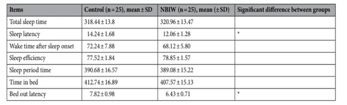 ピッツバーグ睡眠質問票日本語版(PSQI-J:Pittsburgh Sleep Quality Index Japanese version)により、通常入浴よりも中性重炭酸イオン水(NBIW)温浴で睡眠の質に関して有意な改善を認めました。また、活動量計でも通常入浴よりも中性重炭酸イオン水(NBIW)温浴で睡眠潜時(ベッドに入ってから入眠までに要する時間:寝つきの良さを反映)と離床潜時(目覚めてからベッドを離れるまでに要する時間:寝覚めの良さを反映)に関して有意な改善を示し、中性重炭酸イオン水(NBIW)温浴がよりよい睡眠に関して有効であることが実証されました。