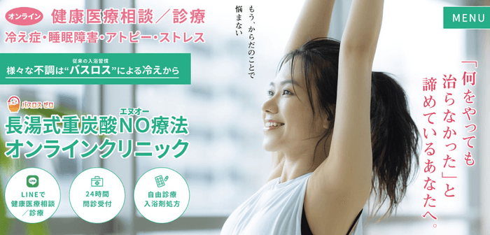 バスロスゼロ療法(長湯式重炭酸温浴NO療法)オンラインクリニックでは、担当医と温浴療法の専門家が協力し、患者様一人ひとりに合わせたアドバイスをオンラインで提供します。24時間質問票受付やLINEでの健康医療相談/診療が可能です。