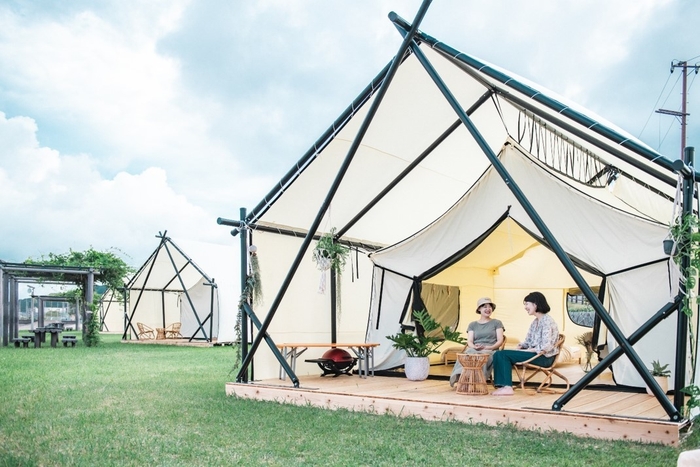 グランピングテントはビーチの芝生エリアに5棟が立ち、シングルベッドが4台常設(定員4名)。夕暮れ時はトワイライトが美しく雄大な自然の中で夕食のBBQを楽しむことができます。