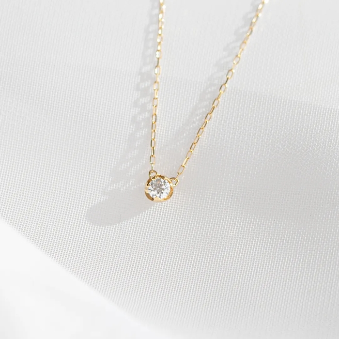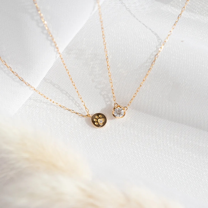 小さくて可愛らしい肉球をシンプルなコインモチーフに落とし込んだネックレスで、中央にダイヤモンドを一石あしらっています。