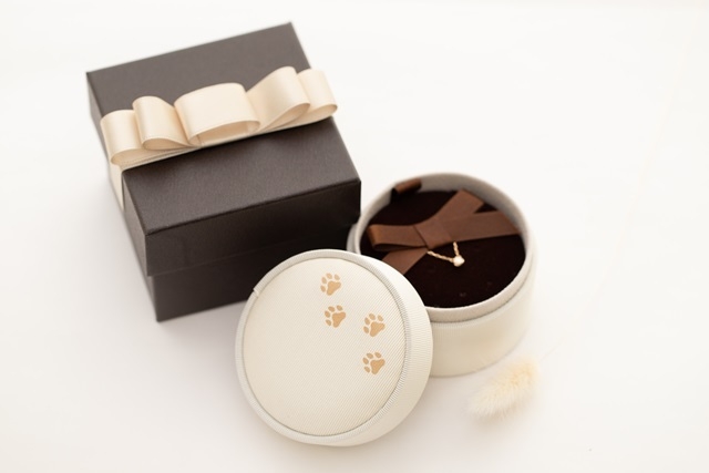 オレフィーチェオリジナルのジュエリーボックスにキュートな肉球モチーフをプリントし、小さな猫や犬がBOXの上をパタパタと歩き回ったような可愛らしいBOXに仕上がっています。