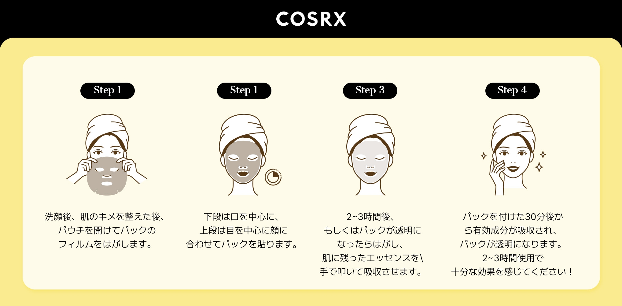 ・2〜3時間程度、マスクパックが透明に変化するまでご使用ください。