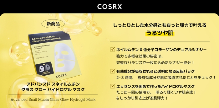 新商品「アドバンスド スネイルムチン グラス グロー ハイドロゲル マスク」は、アメリカAmazonランキングNo.1※にもなり、世界中で長年愛され続けてきた「アドバンスドスネイル 96ムチンパワーエッセンス」を固めて作った贅沢なパックです。純粋なカタツムリ粘液が96%配合されたエッセンスの鎮静・保湿効果はそのままに、2~3時間使用することで有効成分を肌の奥深くまで届けるハイドロゲルマスクタイプの製品で、コラーゲンやヒアルロン酸など、肌の弾力を引き出す効果が期待でき、乾燥が続くこの季節にぴったりなアイテムです。