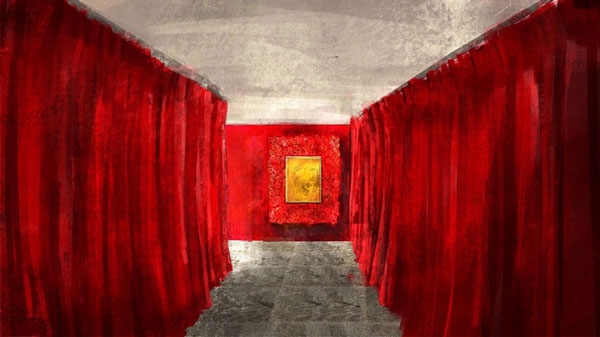 本展のために描き下ろされたキャラクター達のイラストを、ネロが過ごしたホールのような空間に等身大に近いサイ