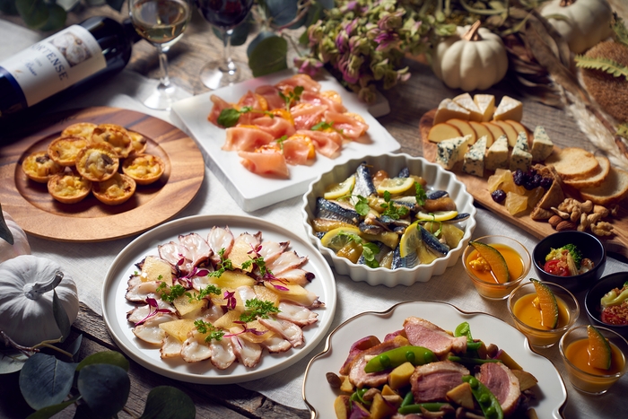 旬の食材が豊富なこれからの季節を存分に味わえるメニューをご用意いたします。ライブコーナーには、”ラム肉と春菊のピリ辛しゃぶしゃぶ”の食欲そそる香りが広がります。くり抜いたかぼちゃを丸ごとグラタンにした”ごろごろかぼちゃのクリームグラタン”や“秋鮭と茄子のオーブン焼き”、“松茸ご飯”など、食材の旨味をご堪能いただけるメニューはもちろん、ワインにぴったりの前菜やおつまみ、また女性に嬉しいスイーツも豊富に取り揃えております。