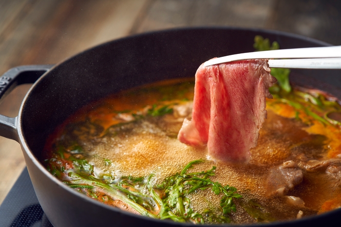 目の前で焼き上げる”牛肉の鉄板焼き”や、旬野菜の揚げたて天ぷらの他、柔らかいラム肉と程よい食感の春菊が絶妙にマッチした”ラム肉と春菊のピリ辛しゃぶしゃぶ”をご用意。 鉄分やビタミンB12など女性にうれしい栄養素を含むラム肉と赤ワインのマリアージュは特にオススメです。