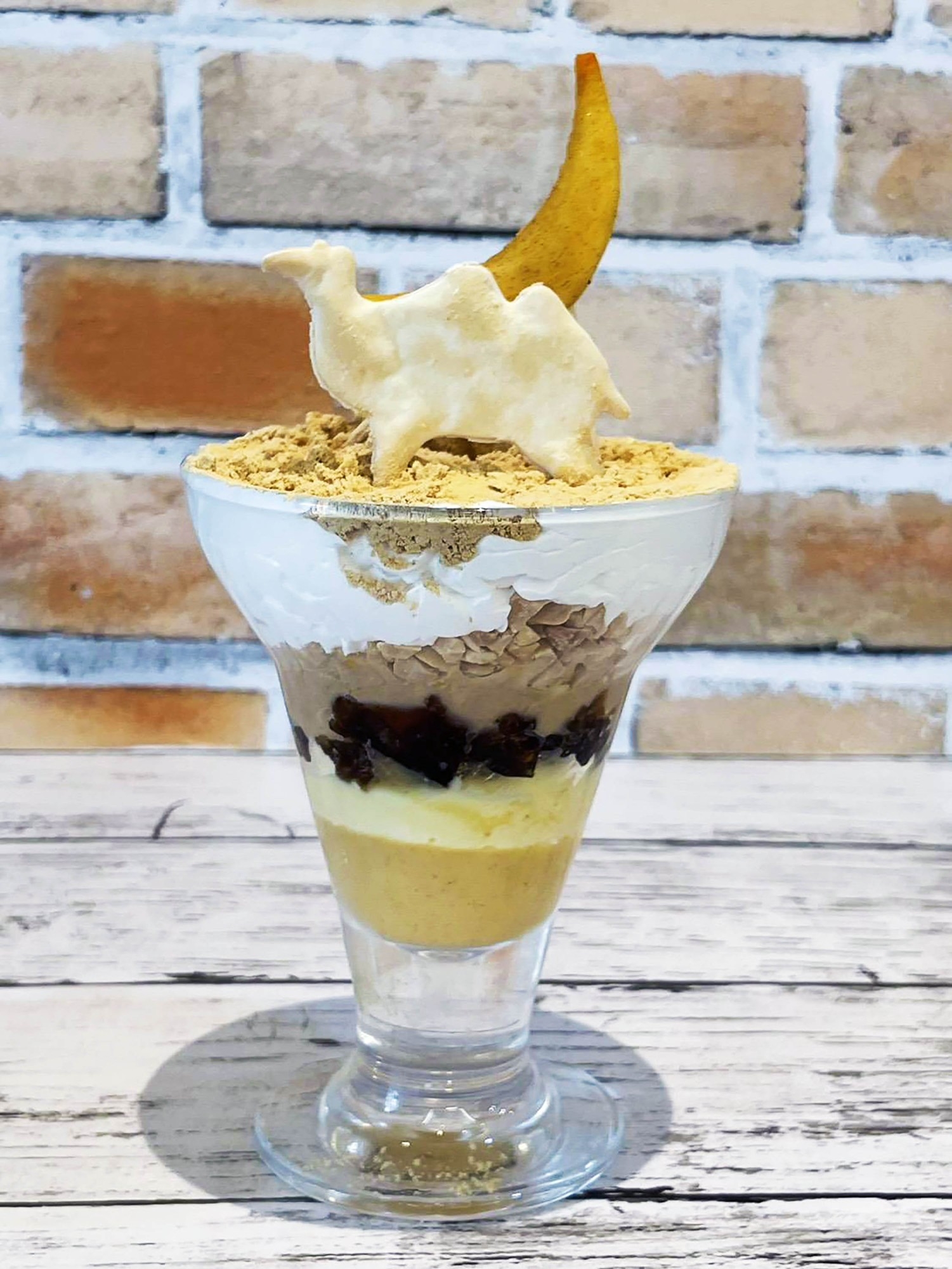 鳥取県と「砂」の友好同盟を締結したヨルダン館で販売され大人気だった「サンドアート」をイメージし、鳥取県産の柿やきな粉を使用した和風パフェです。