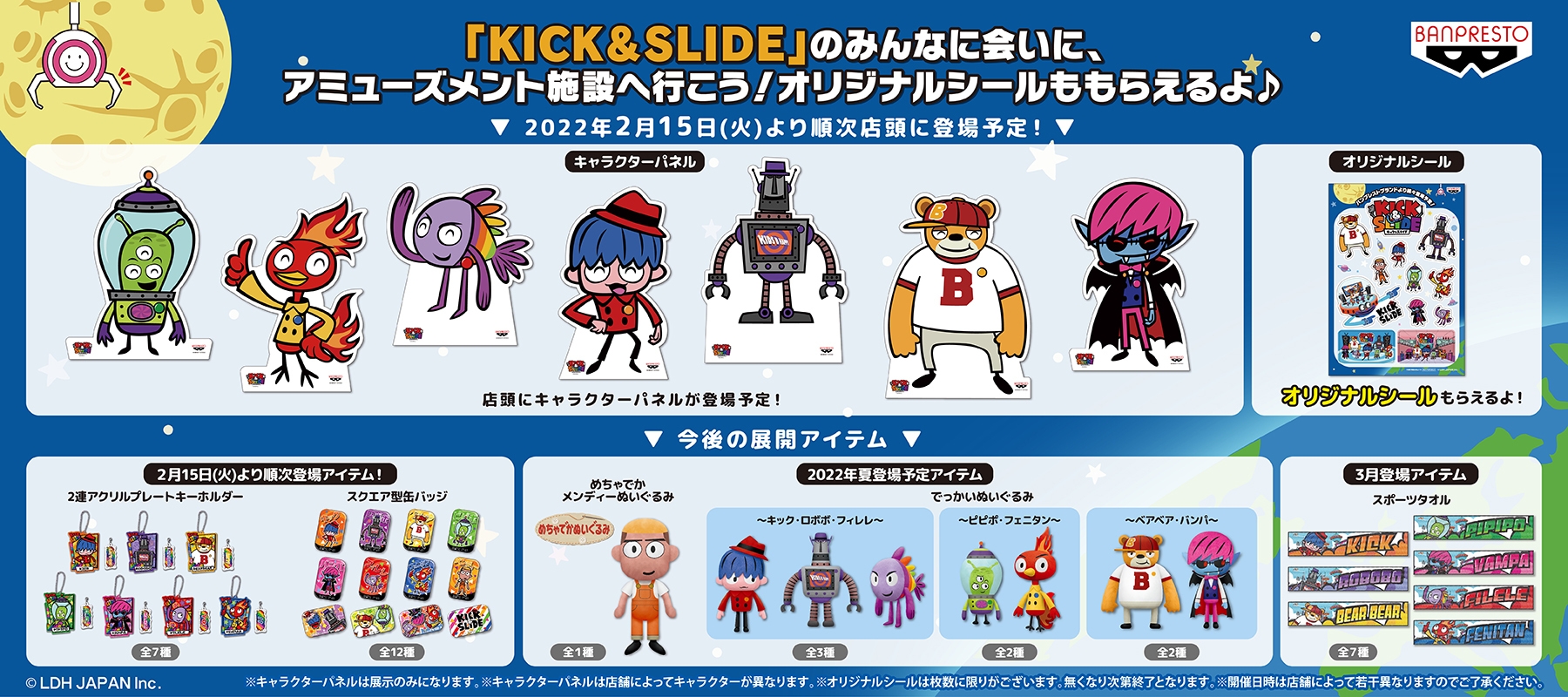 さらに、プライズ初登場を記念して、全国のアミューズメント施設で『KICK&SLIDE』の世界観を身近に感じていただくことができるよう、キャラクターパネルを設置するほか、オリジナルデザインのシールがもらえる、「「KICK&SLIDE」のみんなに会いに、アミューズメント施設へ行こう!オリジナルシールももらえるよ♪」を開催いたします。