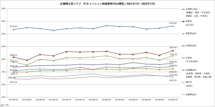 2022年7月の推定価格は4,310万8,300円。近畿圏全体の平均価格と比較して、約1,700万円近く高い。なお、近畿圏で価格がもっとも高い府県は「京都府」で、推定価格は3,141万200円。