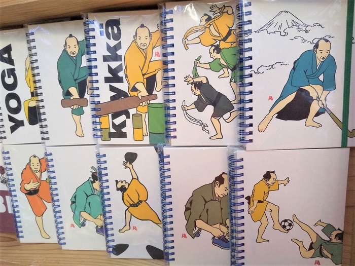 変わり種では、お侍さんが現代スポーツに挑むEDO×SPORTSシリーズのイラスト。文房具から日用品まで、身の回りのグッズにお侍さんがかわいく陣取ってます。