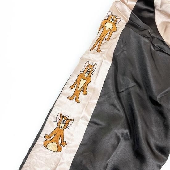 まずは、こちらのスカジャンからご紹介していきます。トムがジェリーを追いかけている、まさにトムとジェリーといえば!というデザインです。トムの本気で追いかけている顔とジェリーのおちょくっているような顔が二人の関係性を表していてトムジェリファンにはたまりません!