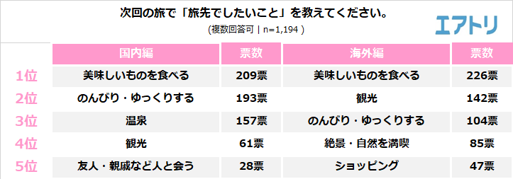 また旅先でやりたいことは、国内旅行でも海外旅行共に「美味しいものを食べる」がTOPとなりました。