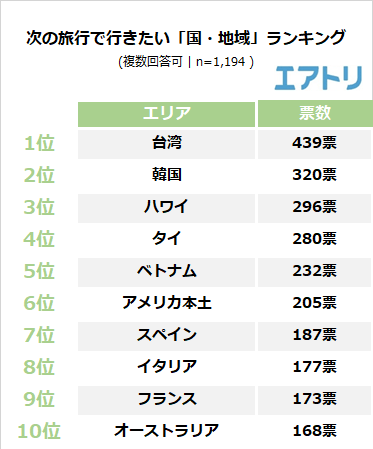 119票もの差をつけて1位になったのは「台湾(439票)」でした。続いて2位は人気の「韓国(320票)」、円安の影響を受けてか3位となったのは「ハワイ(296票)」という結果になりました。TOP10を見るとアジアが4ヵ国ランキング入りしており「安・近・短」の需要が高いことがわかります。