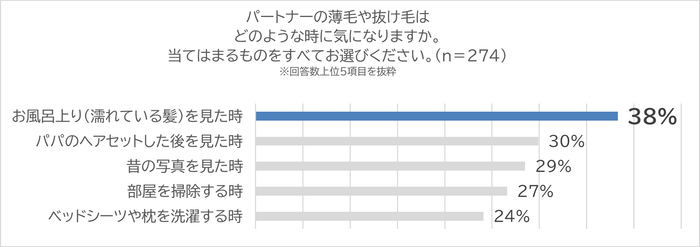 さらに、「パパの薄毛・抜け毛がどのような時に気になったのか」をお聞きしたところ、「お風呂上がり(濡れている髪)を見た時」が38%と最も多く、「ヘアセット後」「昔の写真を見たとき」などの回答が続き、ふとした瞬間にパートナーの薄毛や抜け毛が気になっていることがわかりました。
