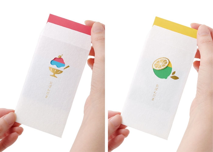 封筒の中にはツートーンカラーの添紙(そえがみ)が入っています。添紙には中身が透けて見えないようにする役割があるのですが、それだけではなく、上下の向きを替えたり少しずつ出し入れしたりすることで、窓から覗く色が変化するのです。例えば、かき氷はいちご味からブルーハワイ味に、レモンはグリーンレモンに変化します。
