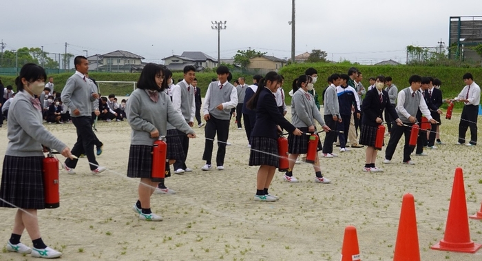 本校では毎年、全校生徒を対象に、災害発生時の的確な判断力や自己防衛力、他者に対する援助の気持ちを学ぶことを目的として、避難・消防訓練を実施しています。今回は全校生徒933人が参加し、緊急地震速報の発表時を想定した避難訓練を実施します。また、避難終了後には、飯塚消防署による消火器の使用方法の説明や、水消火器を用いた消防訓練も行います。