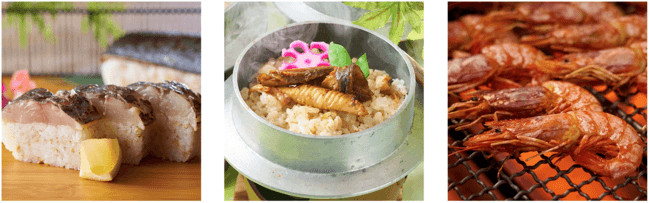 ◆ながやま:夕食にはサーロインステーキや能登ポークのしゃぶしゃぶなどスタミナメニューが並びます。朝食のながやま名物釜飯には夏季限定「たっぷりうなぎの釜飯」が登場します。小さな釜で一人分ずつ炊き上げる、炊き立てのお米の美味しさに朝から笑顔が溢れます。