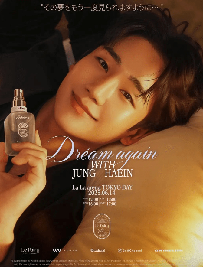 株式会社360Channel(本社:東京都港区、代表取締役社長:小松恵司)は、株式会社VENEW(本社:東京都渋谷区、代表取締役社長:金聖勲)らとの共同で、韓国発のプレミアムフレグランスブランド「Le Fairy(ル・フェアリー)」の日本初上陸を記念した体験型イベント「Dream Again with JUNG HAEIN」を2025年6月14日(土)にLaLa arena TOKYO-BAYにて開催いたします。本イベントには、韓国の人気俳優チョン・ヘインさんが「ル・フェアリー」のモデルとして来日し、顧客の皆さまとの貴重な交流をお楽しみいただけます。