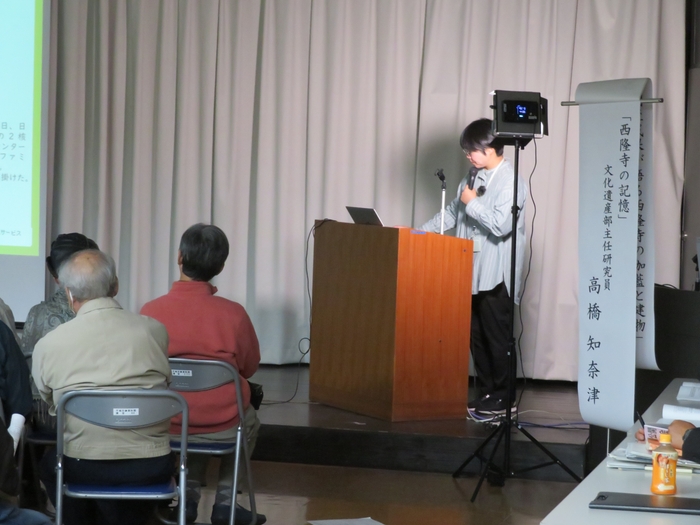 本中所長による挨拶の後、箱崎部長による「発掘調査成果が語る西隆寺の伽藍と建物」、奈良市埋蔵文化財調査センター調査係吉田主務による「西隆寺跡第9次調査の成果について」、高橋主任研究員による「西隆寺の記憶」と題しての講演がありました。