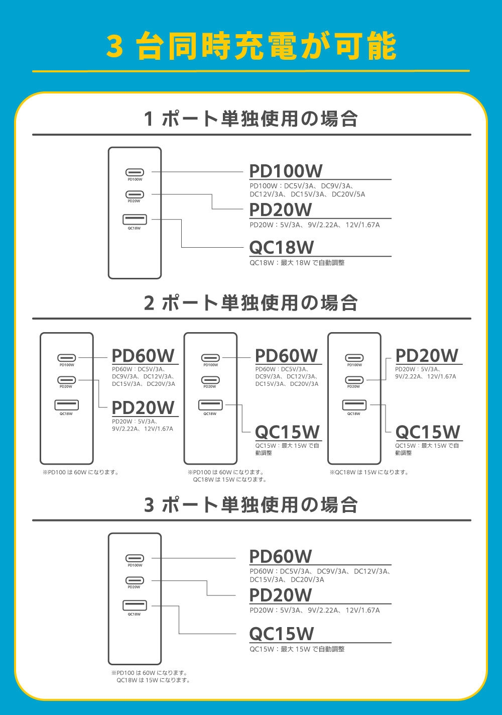 PD100W、PD20W、QC18WのUSBポートを搭載。3台同時に充電が可能です。対応出力は下記のとおり。