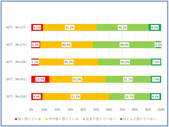 「自分自身が熱中症になる危険性をどの程度感じているか」との質問については、「強く感じている」が8.8%、「ある程度感じていない」が44.1%で5割強が危険性を感じていると回答した【グラフ5】。ただし、年代別では特に顕著な差が見られなかった【グラフ6】。