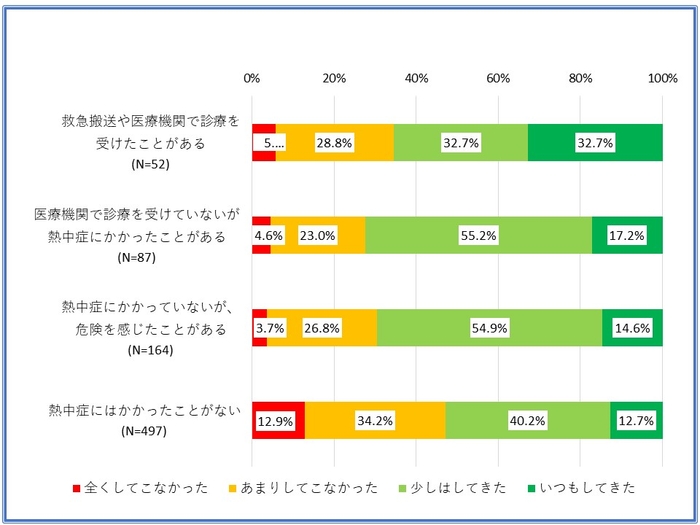 一方で、「これまでの暑い時期に、どの程度対策をしてきたか」との質問については、「いつもしてきた」が14.9%、「少しはしてきた」が44.4%で、対策をしてきた人は全体の6割未満となった【グラフ3】。本調査の監修にあたった関東学院大学准教授の大友章司氏は「ダイエットしようと思っても行動できないなど、動機と行動の乖離の現象として考えられる。人は、やりたいという動機を持っていても面倒だとか、それまでの習慣が障害となって行動に結びつけることができない。実際に行動している人を見ると、熱中症を経験している人などであり、熱中症が自分にも起こるリスクとして捉えることが重要である」とコメントしている。