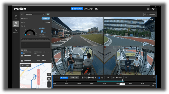 自動運転を実用化するためには、車室内の乗客や車両周辺の状況を遠隔地からモニタリングすることが求められます。everfleet(エバーフリート)ではモビリティの位置情報や車内外のカメラ映像に加え、車速・ステアリング・バッテリー残量などの車両データを統合して一元的に可視化し、信号機などの交通インフラと協調した外部データとの連携も可能です。これにより、運行状況を遠隔地からリアルタイムに把握し、安全・安心に自動運転モビリティを運用することができるようになります。さらに、複数地域の多種多様なモビリティを同時に群管理することや運行時の異常をシステムによって自動的に検出・通知することができるため、1人の遠隔オペレータによって、効率よく自動運転モビリティを運行管理することで、オペレーションの省人化を実現し、交通採算性の改善にも貢献します。