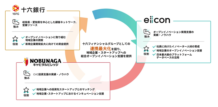 地域に「新規事業創出」「オープンイノベーション」を実装させるために、岐阜県・愛知県を中心に地域企業へ密着した支援を行ってきた「十六フィナンシャルグループ」と累計登録32,000社『AUBA』を中心に、これまで1,700件を超える共創を支援してきた新規事業開発のプロフェッショナル 「eiicon」が協力タッグ。各社の強みを活かして、オープンイノベーションを活用し新規事業創出まで導くオープンイノベーション支援を通して、地域企業・産業の活性化を目指します。