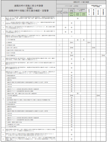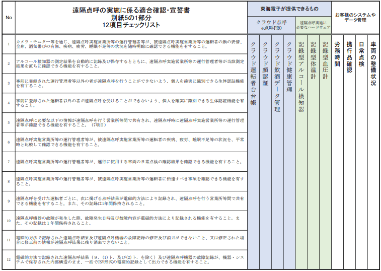 遠隔点呼の申請にあたり、12項目の適合宣言が必要です。以下、12項目チェックリストと当社の製品群の適合表です。