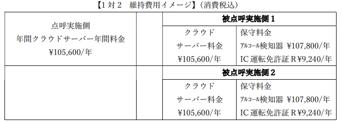 以下は、1対2(酒気帯び確認は、被点呼実施側2ヶ所)で IT点呼を行う場合の初期費用です。