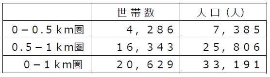 ・店舗から1㎞圏内は、単身世帯比率が65.7%、2人世帯が19.5%と全体の8割以上が少人数世帯です。