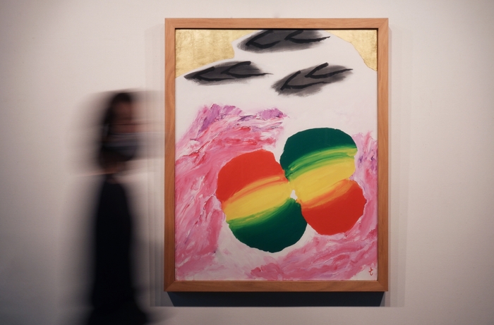 画面に広がる原色と金箔の鮮やかさは、生命力に満ちエネルギッシュな印象を与えます。また抽象的なモチーフや油彩の厚塗りが施された細部などは当時の西洋美術からの影響が見てとれる1点です。