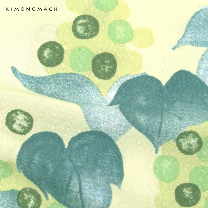 淡い若葉色と薄い黄色のぼかしの地。深緑色の水玉と共に、白のミズクラゲが漂っています。淡くにじんだような表現が水中の揺らめきを感じさせます。