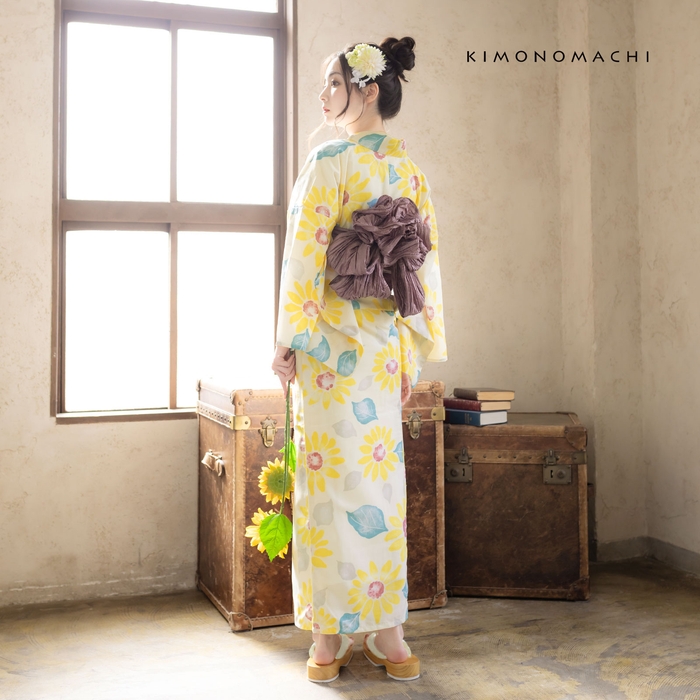 オフホワイトの地に明るい黄色のひまわり。小豆色の花芯、浅葱色、薄グレーの葉。ところどころ白で淡くにじんだような表現が夏らしさを感じさせます。