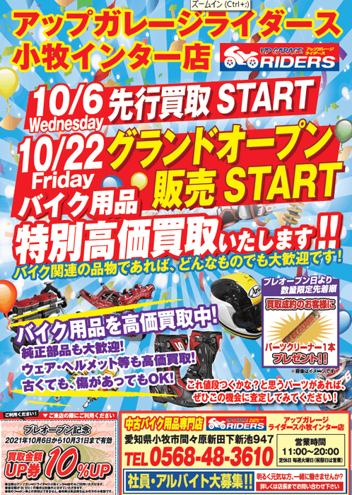 プレオープンの際には、バイク用品の買取金額を10%UPさせていただきます。