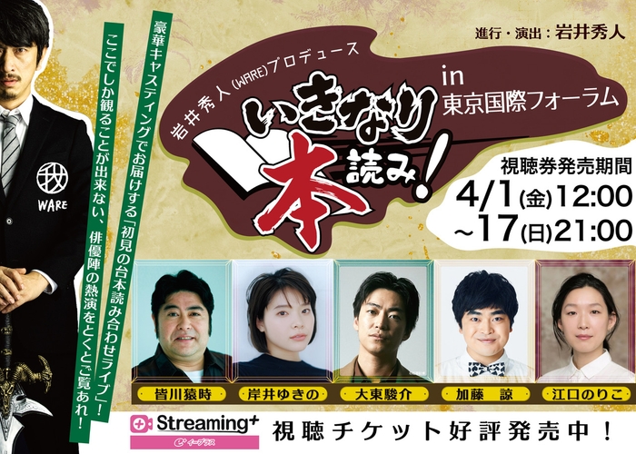 劇団ハイバイ主宰 岩井秀人がプロデュースする、初見の台本読み合わせライブ「いきなり本読み!」。皆川猿時、岸井ゆきの、大東駿介、加藤諒、江口のりこを迎え、岩井秀人が自作のRPG演劇「エンド・オブ・ワールド」を演出した年末の東京国際フォーラムの模様が、満を持して本日4/1(金)より配信開始。視聴券代1,500円(※別途手数料あり)にて、イープラスが運営する「Streaming+」より、4/17(日)まで配信中です。劇場でご覧いただいた方も、未見の方も、この公演でしか観ることが出来ない、一夜限りの、豪華俳優陣の熱演を是非ご覧ください!