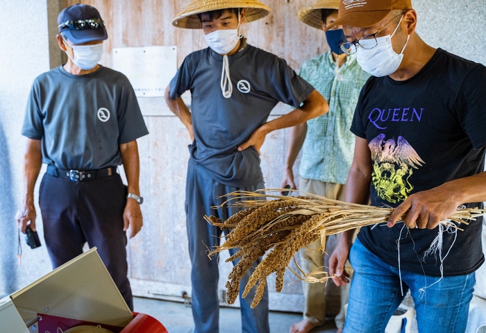 2021年1月施設内の畑に伝統手法で作付けした粟は、6月に穂をつけ無事に収穫しました。同時期に財団でも島の畑で粟の収穫がおこなわれ、合計収量は約30キログラムでした。これは以前、星のや竹富島が種の保存のために単独で栽培していた頃の約15倍です。収穫した粟は今後特産品開発に活用するため、2021年9月6日、脱穀・精穀講習会を竹富島公民館「まちなみ館」で実施。沖縄県農業協同組合の吉田洋介(よしだようすけ)氏を講師に、財団員3名、星のや竹富島のスタッフ6名が参加しました。粟の6次産業化を目指す上では、効率的な粟の加工が必要です。そのため本講習会では機械を用いた脱穀と精穀方法を学びました。しかし「粟豊年プロジェクト」では、島の方々の知恵が凝縮した昔ながらの栽培方法や加工方法を学ぶことも重視しています。粟そのものだけでなく、島の歴史文化も継承したいと考えているためです。そこで本講習会を実施する約1か月半前、島で唯一の粟の栽培者である前本隆一(まえもとりゅういち)氏のもとで伝統手法の脱穀・精穀を学び、実践しました。