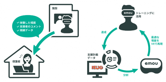 HUGは、1,000以上の支援施設に導入されており、現在約2万人の利用者の支援計画や療育に役立つ情報などのデータを所有しています。emouでは、この支援計画データを、抽出・解析し、支援施設の利用者1人1人の課題解決を目指し、新たなソーシャルスキルトレーニングVRコンテンツを開発していきます。今後は、emouでの療育の履歴を、HUGで作成した個別支援契約とも連携させることで、利用者本人と支援者だけではなく、保護者との共有もスムーズに行なっていきます。