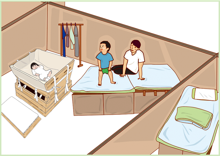 冷気や埃などから子供を守り、安心感を与えることができ、避難場所等でも普段に近い環境で休ませることができます。