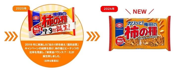 米菓No.1※ブランド『亀田の柿の種』 8年振りのパッケージリニューアル 2024年2月上旬より全国展開 「カリッと食感」へのこだわりを表現!58年間愛される人気のヒミツはその食感!?