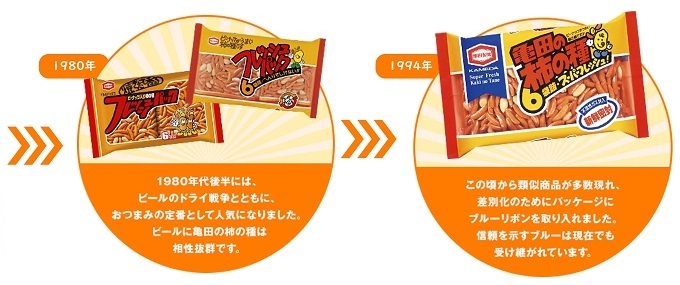 「亀田の柿の種」にピーナッツが入ったことにより、1966年からその歴史をスタートさせた「亀田の柿の種」。そこから約58年間に渡って、現在の新パッケージに至るまで時代の変化と共に様々な進化を遂げてきました。長年にわたって愛されるロングセラー商品となった「亀田の柿の種」のパッケージのこれまでの変遷をご紹介します。