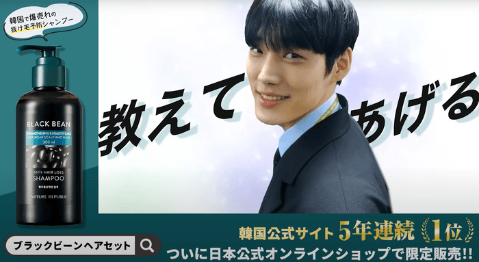 本CMは、韓国の公式オンラインストアで累計70万個以上(※2019年1月~2023年12月 韓国内販売数)の売上を誇る「ブラックビーンシャンプー」の日本初上陸に伴う認知獲得を目的に制作されました。内容は、髪に悩みを抱える女性がエレベーターで前に立っている髪の美しい男性を発見し、「教えてくださいよ〜きれいな髪のお兄さん〜!」と呼びかけると、韓国人男性が髪をさらさらさせながら振り返り、「教えてあげる」と韓国語で微笑みながら応える姿をドラマチックに描いています。