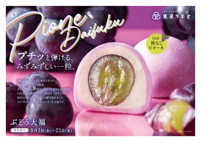 8月は、爽やかな香りにあふれる果汁と甘さが特徴の、皮ごと食べることのできる国産種なしピオーネを、白州名水を使用したすっきりとした白あんと国産巨峰ピューレを加えた餅で包んだ『ぶどう大福』(1個291円(税込)・常温販売)を東京・神奈川直販24店舗にて2024年8月1日(木)~21日(水)まで21日間限定で販売いたします。国産種なしピオーネは大粒なものを厳選しており食べ応え満点!ぶどうのおいしさがぎゅっと詰まった大福です。